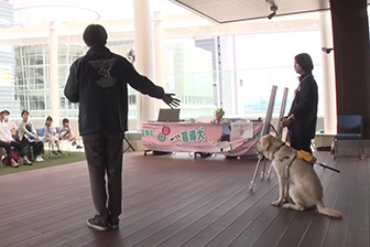また小さな体育館くらいの広さのある会場では、「盲導犬デモンストレーション」として盲導犬の仕事や役割を紹介しています。安心して見学できるよう、職員たちはフェイスシールドを装着するなどして、感染症の予防対策に取り組んでいます。