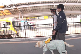 盲導犬ユーザーの鉄道利用についての講習やユーザーと出会ったときの手引きの仕方の実演などが行われました。