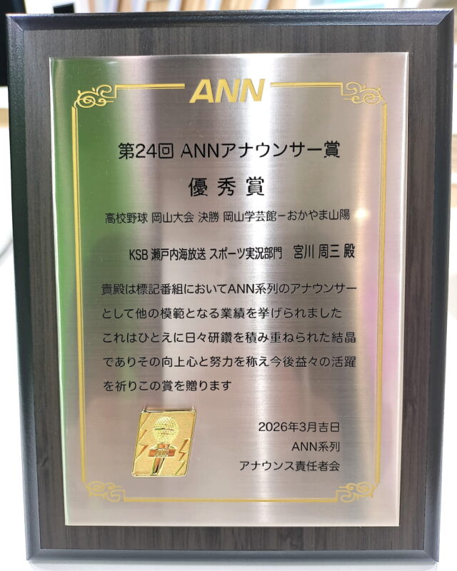 このような賞をいただくことができたのは、ご指導いただいたKSBや系列各社の先輩・仲間たち、何よりも熱いプレーを見せてくれた球児たちのおかげだと思っています。そして、中継に携わってくださった全ての方たち、中継を見てくださった視聴者の方たちに深く感謝します。